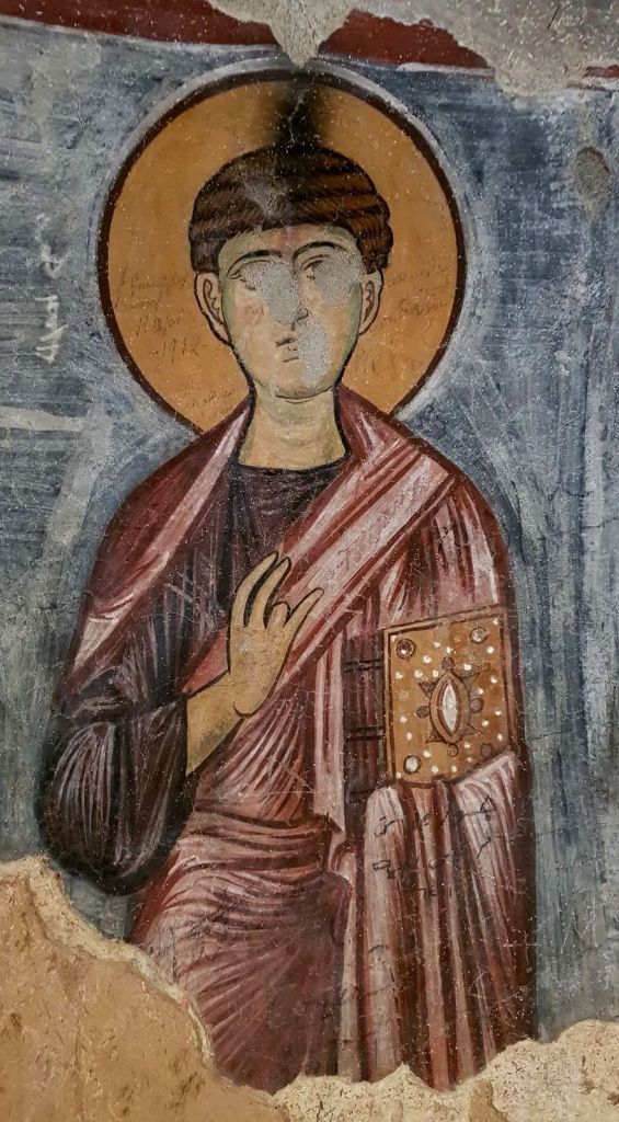 On y trouve une théorie d’apôtres et de saints, malheureusement très endommagés. Sur le mur nord, n’en demeure qu’un fragment. Le mur droit est recouvert d’une grande fresque comportant cinq personnages ayant également la tête auréolée d’un nimbe jaune cerclé de noir. Malheureusement, les visages ont fait l’objet de dégradations, pas seulement dues aux ravages du temps. Yeux et bouches avaient été systématiquement creusés par des vandales. Ces fresques ont, récemment fait l’objet d’une excellente restaurationxii. Tous les personnages étaient accompagnés d’une inscription en syriaque portant leur nom, mais la plupart sont devenues illisibles.