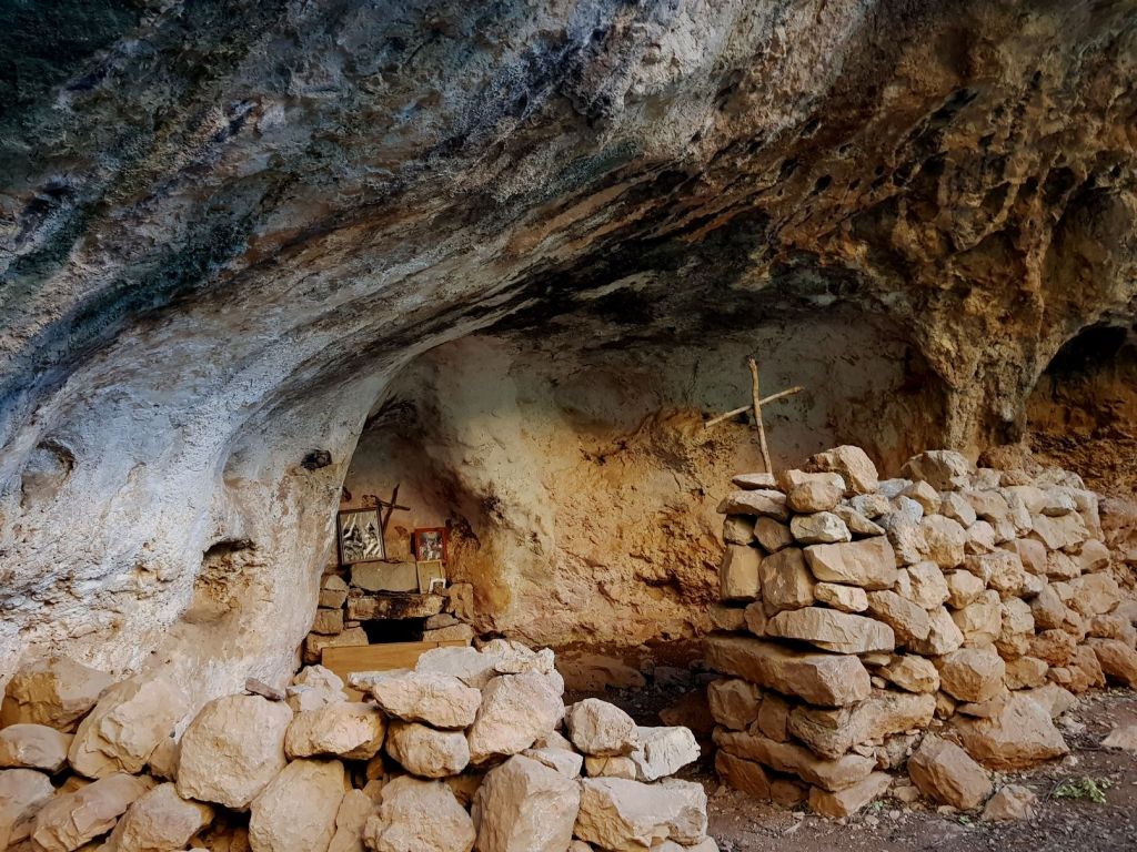 Poursuivant notre chemin, nous traversons un petit torrent (à sec en été), et continuons la descente sur sur l’autre versant. Nous passons sous une sorte de dolmen naturel. Quelques mètres plus loin, à gauche, un canal amenait l’eau à un moulin, aujourd’hui en ruine. À droite, un dentier mène à Deir es Salib. On peut regretter l’escalier monumental et la monstrueuse passerelle peu en accord avec la simplicité du couvent lui-même. La grille franchie (si l’on a pris la précaution de demander préalablement la clef à la maison paroissiale de Hadchit), on se trouve face à une assez grande grotte contenant une église à deux nefs. On y pénètre en passant sous une vaste arcade qui n’a nulle part son équivalent dans la région.