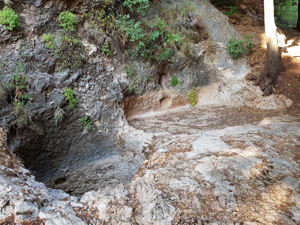Au-dessous de cet ermitage, un trou a été creusé dans le rocher. Il ne s’agit pas, comme on pourrait le croire, d’un puits ou d’une citerne. Il constitue avec l’espace rectangulaire adjacent taillé dans la pierre, un pressoir à vin (Fig 21).