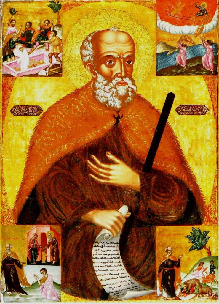 L’autel est surmonté d’une icône de style byzantin de St Élisée (Fig 18), patron du couvent. Elle est datée de l’an 7310 après Adam, ce qui nous laisse, selon le mode de calcul, une marge de quelques siècles!xiiElle provient de l’école d’Alep qui fleurit de 1650 aux premières années du XIXème siècle.