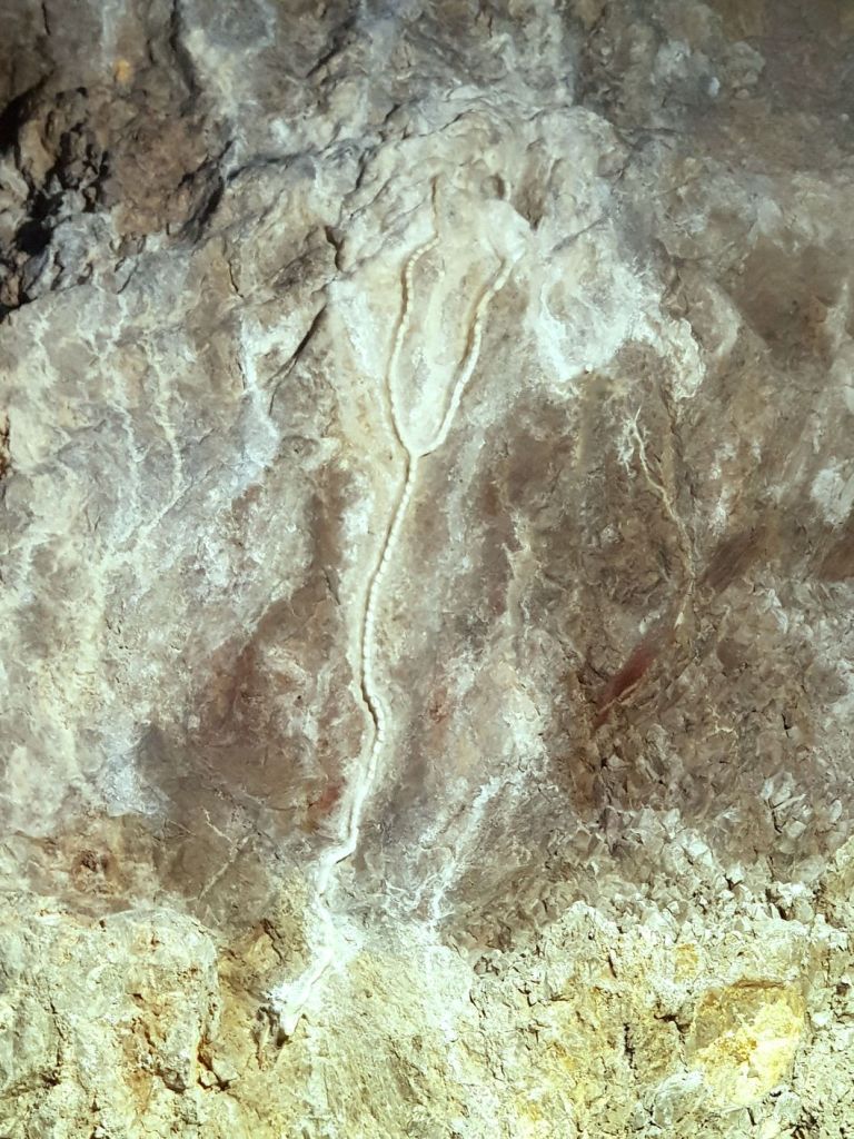 Le chapelet. Un peu plus loin, en levant la tête, on remarque un chapelet (Fig 8) qui semble avoir été sculpté dans la pierre. Il s’agit d’un phénomène tout à fait naturel produit par l’eau chargée de calcaire suintant goutte à goutte du rocher.